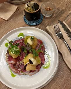 Le chef utilise des produits de qualité pour le déjeuner et le diner, fournis par des producteurs locaux, pour se concentrer sur ce que la Bretagne nous offre dans un concept de menu créatif et à partager (le soir uniquement).